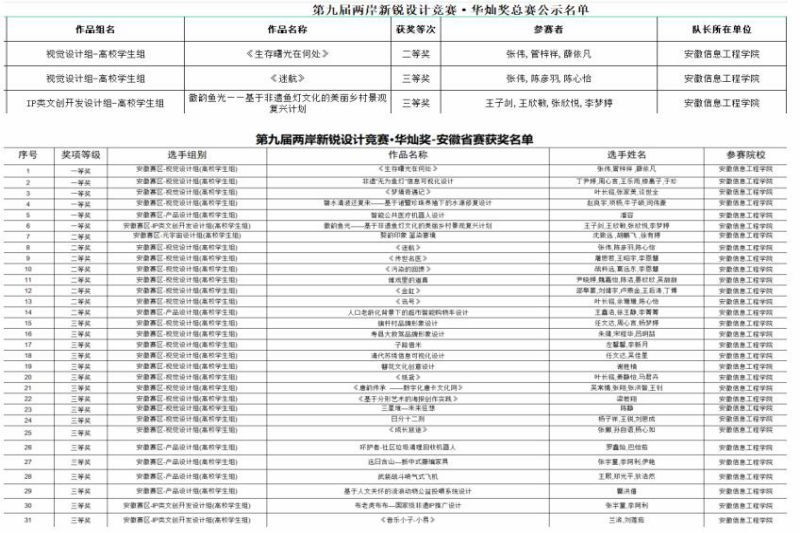 11月11日,第九届两岸新锐设计竞赛·华灿奖正式揭晓了获奖榜单,艺术设计学院的学生们在此次竞赛中表现卓越,收获满满,在安徽省赛区评选中共获得省级奖项31项,其中省级一等奖6项、省级二等奖8项、省级三等奖17项。提交国赛评审后,共获得国家级奖项3项,国家级二等奖1项,国家级三等奖2项。(图为获奖名单截图)(图为安徽省赛区一等奖作品之一《徽韵鱼光——基于非遗鱼灯文化的美丽乡村景观复兴计划》) 两岸新锐设计竞赛·华灿奖是一个旨在发现、推介海峡两岸及港澳地区青年设计师的综合设计赛事。比赛以创新、时尚、实用为评审原则,选拔最具创新意识和培养潜力的青年设计人才。竞赛以“融·和”为主题,鼓励和促进海峡两岸及港澳地区青年设计师融和交流,协同创新,为青年人提供创新创业综合服务平台。华灿奖被列入“2024年全国普通高校学科竞赛排行榜榜单(84项)”竞赛,被教育部纳入“三评一竞赛”保留清单项目。(图为比赛官网宣传海报) 艺术设计学院一直高度重视学科竞赛与专业教学的融合,不仅极大地深化了学生对艺术领域的理解与洞