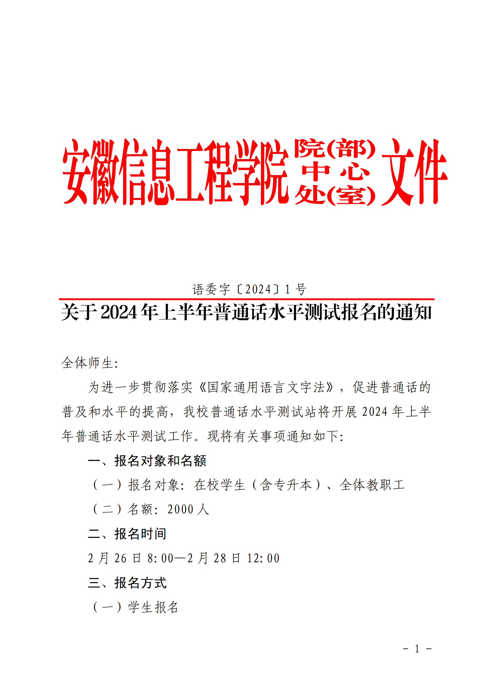 关于2024年上半年普通话水平测试报名的通知