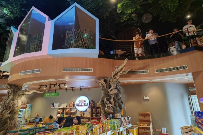(图为松鼠小镇主入口及三只松鼠零食专卖店)