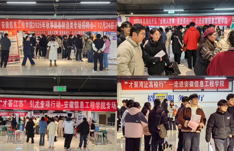 本网讯 12月24日,安徽信息工程学院2025年秋季装备制造类专场招聘会在校大学生活动中心顺利举行。本次活动由江苏省人社厅全程指导,我校联合南京市、宜兴市、芜湖市、六安市及多地人社部门共同举办,旨在搭建优质供需平台,助力毕业生高质量就业。(招聘会现场)招聘会汇聚长三角地区近80家重点企业,其中绝大多数为装备制造领域知名企业,包括雨润食品、长虹美菱、博世空调、中联重科、新思考电机、宝银特材科技等行业头部单位。共提供电控系统工程师、机械设计工程师、工程师助理、储备干部等1500余个就业岗位,精准对接2026届毕业生求职需求。活动吸引了300余名毕业生踊跃参与,现场气氛热烈。多家企业在活动后即刻组织宣介、面试及笔试,为毕业生就业按下“加速键”。此次招聘会不仅有效满足了毕业生多元化就业需求,也为我校2026年春季校园招聘工作奠定了良好基础。(毕业生与企业沟通)学校将以此次活动为契机,继续深化与地方政府、企业的合作,抓住寒假前就业黄金期,持续开展定向招聘活动,进一步拓展就业渠道,全力促进2026届